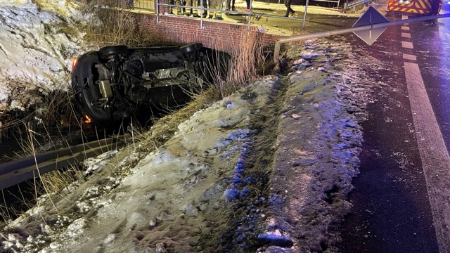 Zu einem Verkehrsunfall wurde die Feuerwehr Wilhelmshaven Freitagnacht, 30. Januar 2026, nach Sengwarden gerufen. Auf der Jeverschen Landstraße war kurz vor Mitternacht ein Auto aus bisher ungeklärter Ursache von der Fahrspur abgekommen und auf die Gegenfahrbahn geraten. Dort durchbrach das Fahrzeug die Leitplanke, riss eine Laterne um und kam rund zwei Meter unterhalb der Straße im Inhauser Tief zum Stehen.