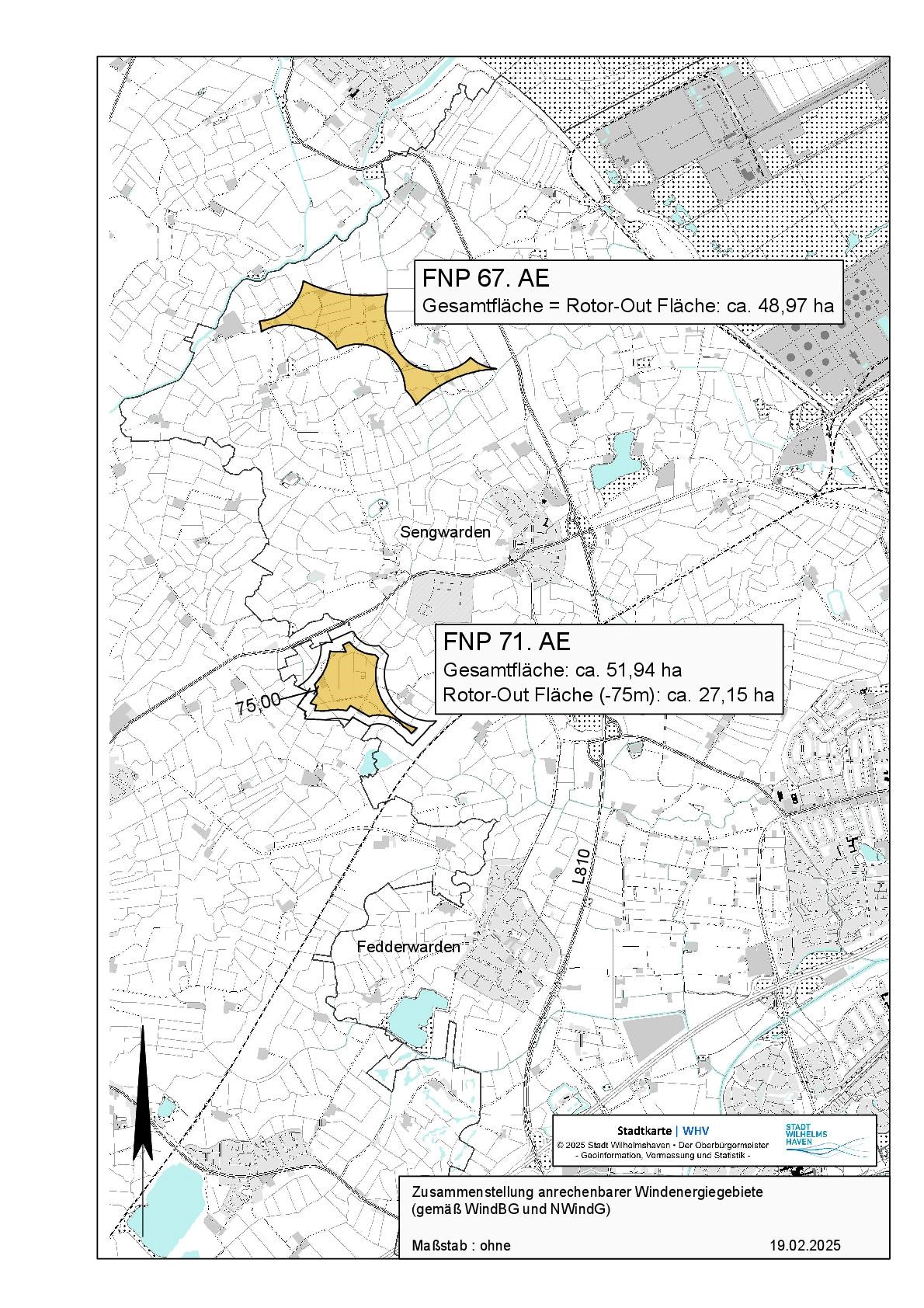 Im Flächennutzungsplan der Stadt Wilhelmshaven sind „Sonderbauflächen Windenergie“ mit einer Größe von insgesamt ca. 215,62 ha (2,01% des Stadtgebietes) dargestellt. Von den Sonderbauflächen im Flächennutzungsplan werden die Flächen der 71. Änderung des FNP (Anzetel) mit 27,15 ha als Rotor-out –Fläche (nach Abzug des gem. § 4 Abs. 3 Satz 4 WindBG festgesetzten Wertes von 75 m) und der -67. FNP Änderung (Westerhausen/Utwarfe)- mit 48,97 ha als„Rotor-out“Fläche angerechnet.