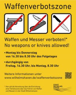 Auf Beschluss des Rates der Stadt Wilhelmshaven wurden in Wilhelmshaven Waffenverbotszonen eingerichtet. Was innerhalb dieser Verbotszonen für Regelungen gelten, ergibt sich aus der vom Rat beschlossenen Verordnung. Welche Bereiche von dem Verbot betroffen sind, ist in der Anlage 1 textlich und in Anlage 2 bildlich dargestellt.